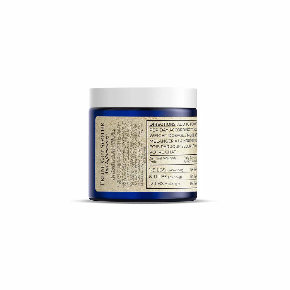 Feline gut soothe contains a pre and probiotic blend with anti-inflammatory nutraceuticals and herbs to help soothe your cats tummy.