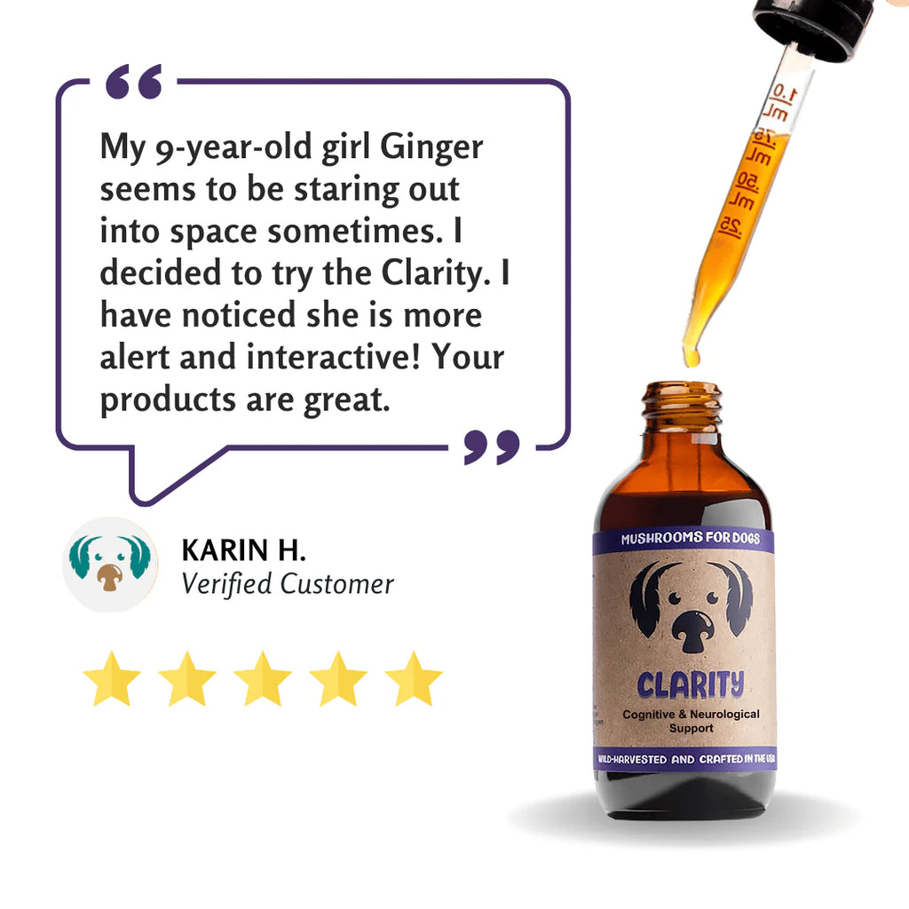 Clarity is a blend of natural adaptogens and mushroom extracts from wild-harvested and naturally cultivated mushrooms, formulated to support cognitive function, emotional balance, and nervous system health in dogs.
