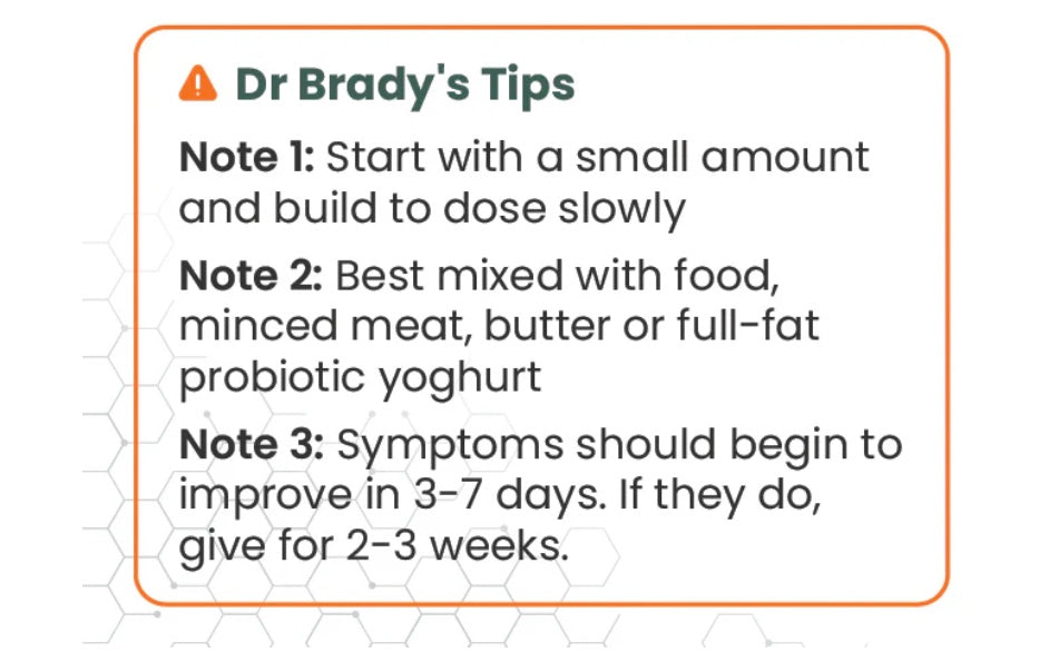 • Mixing with their food is fine, but even better if it was added to some broth or even some tasty, whole-fat, natural yoghurt and given BEFORE a meal so that the enzyme works only on the yeast and not on the food, but this step isn’t vital.
